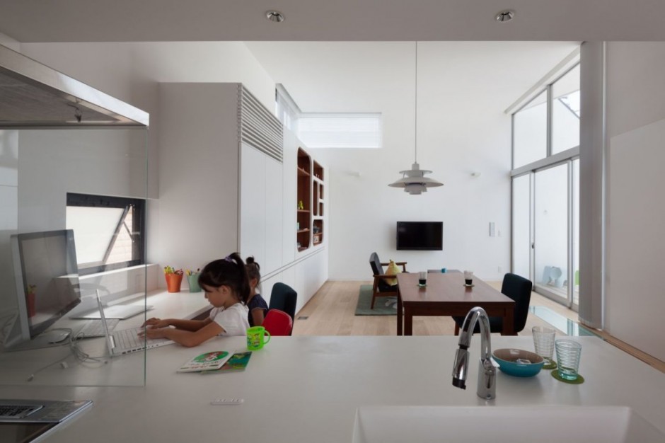 The second floor Living/Dining/Kitchen space enjoys a ceiling height of more than 3.5 meters. Looking towards the street you are able to view the triangular cutaway corner framing the hills beyond, as well as the symbolic tree sprouting up from the first floor. This tall ceiling brings in enough light to brighten up the Loft, creating a sunny, playful space for the children, while still being connected to the living room below. The cutaway corner of the exterior wall is adjusted so that it comes down to a height of a handrail, creating privacy at just the right level without completely enclosing the second floor outdoor terrace. The windows placed throughout the East and South side of the house take into consideration the neighboring buildings and so are located at relatively high locations, controlling both light and the view into the home.